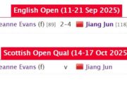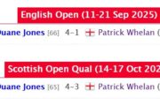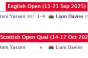 Wie dem auch sei, ich freue mich, dass sich Steven Hallworth qualifiziert hat. Auch wenn es am Ende durch Luca Brecels erneute Absage passierte. Auch David Grace kann sich glücklich schätzen. In seinem Fall war es Luy Haotian, der abgesagt hat. Leider hat Bai Yulu nur eins ihrer Spiele gewinnen können. Nach einem 4–0 gegen Kreishh Gurbaxani kassierte sie dann selbst einen Whitewash gegen Robbie Williams.